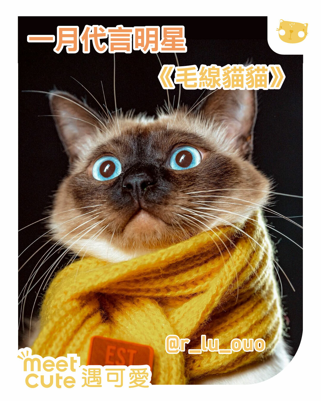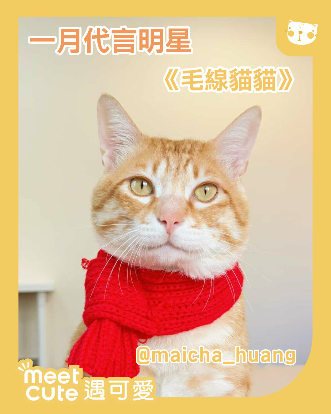 首頁遇可愛明星2026|一月代言《毛線貓貓》 maicha_huang 黃麥茶 今天要公布第一位毛線貓貓! 圍上紅通通的毛線圍巾,整個氣場變成冬日暖心小模特兒~ 坐得端端正正,是在準備迎接冬天的可愛任務嗎? r_lu_ouo Komekko 第二位毛線貓貓代言中選登場! 圍上暖暖的毛線圍巾,一雙天藍色眼睛閃閃發亮~ 彷彿把冬天的光都收進眼睛裡,怎麼看都移不開視眼 Back